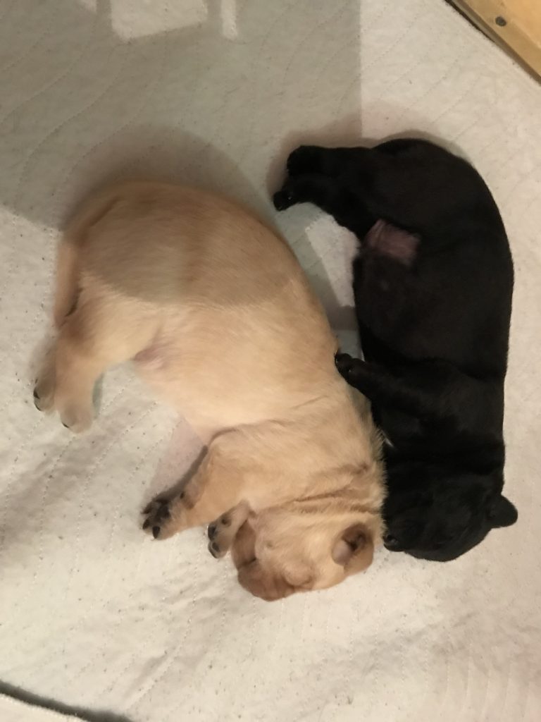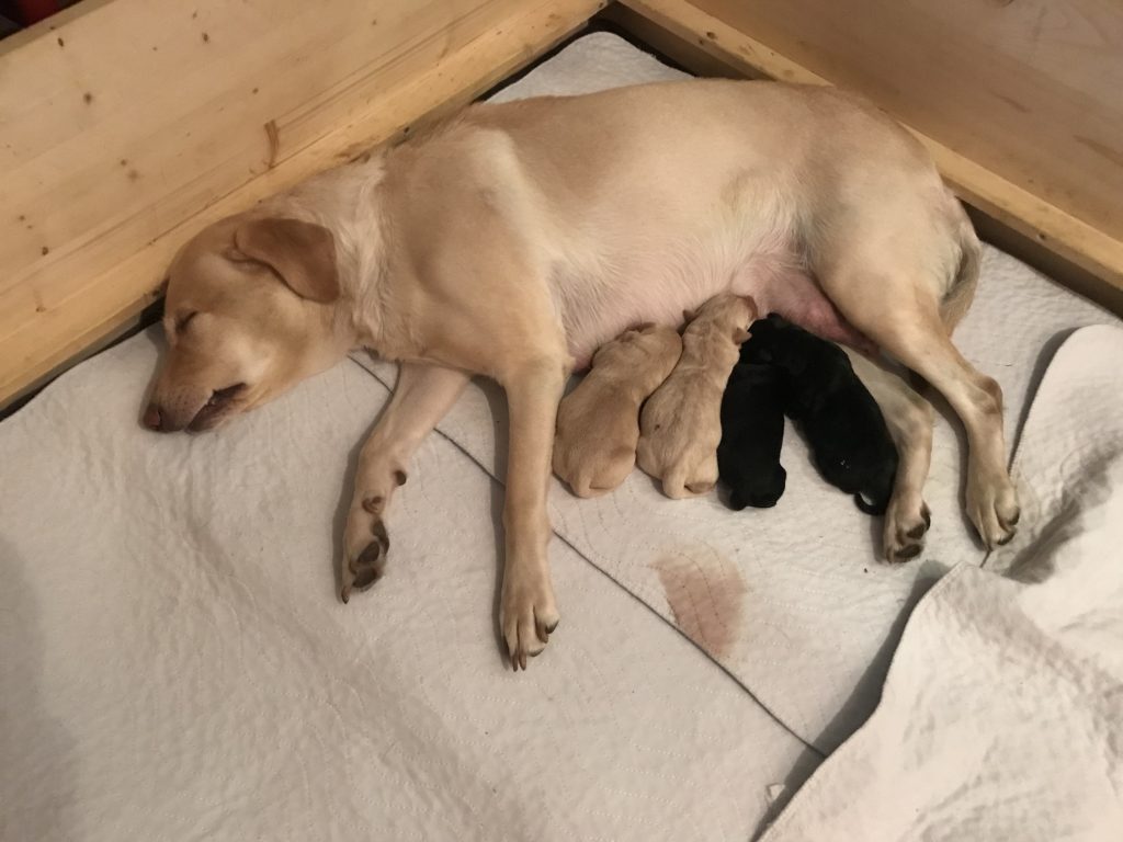 Unsere Nugget hat am 22.11.2022 vier gesunde Welpen bekommen. Wir freuen uns über zwei schwarze und zwei gelbe Rüden.