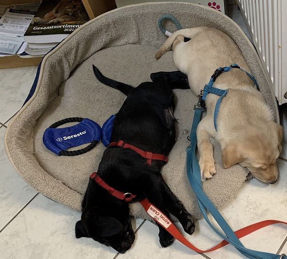Die Welpen werden auch in die Arbeit mitgenommen, um das Ruhigbleiben in ungewohnten Umgebungen zu üben.