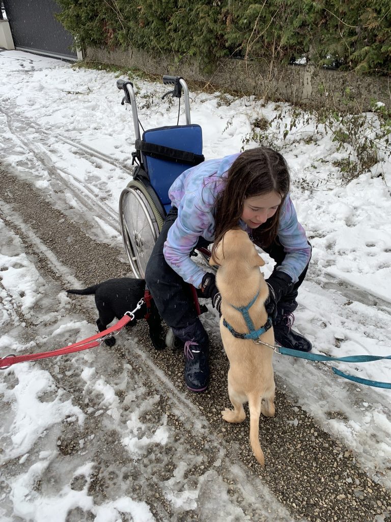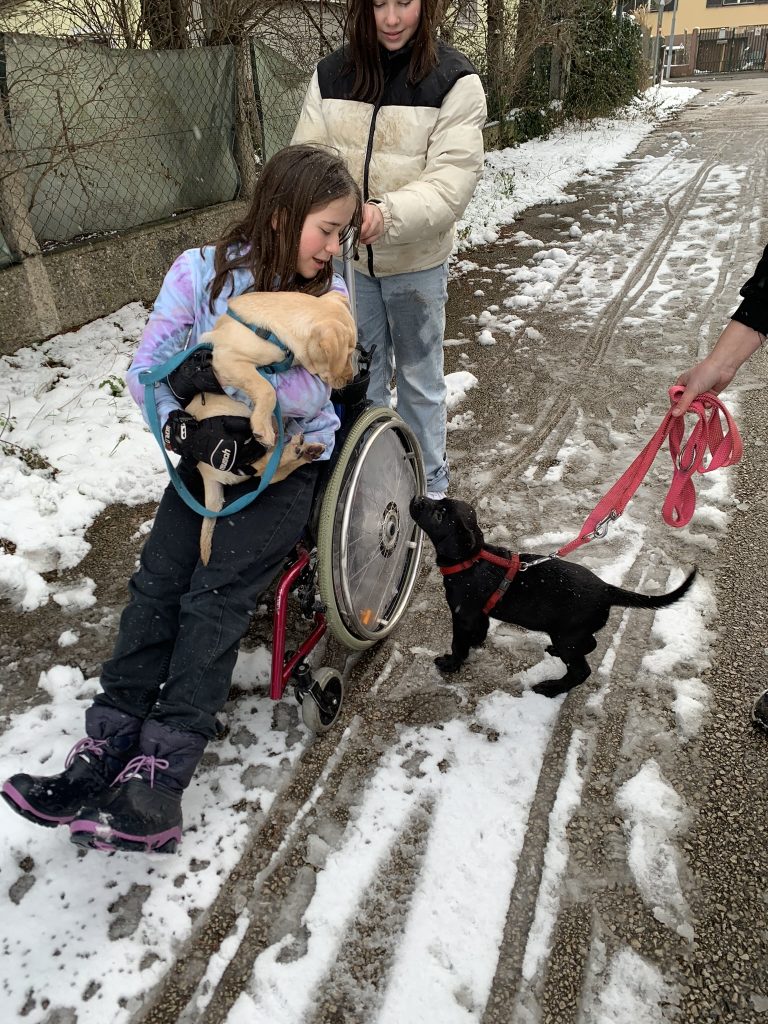 Welpen sollen während der Sozialisierungsphase möglichst viele Dinge kennen lernen, die ihnen im späteren Leben begegnen. Hier z. B. Rollstuhlfahrer.